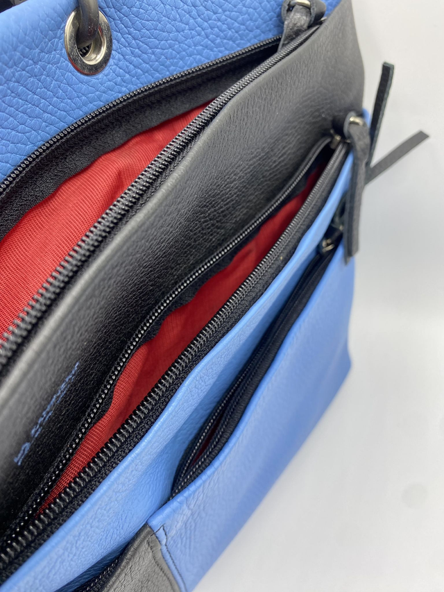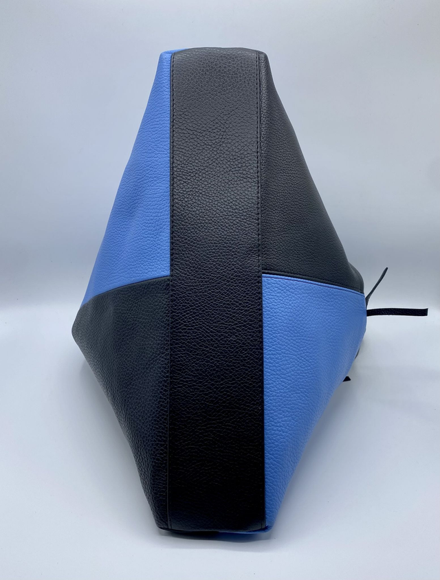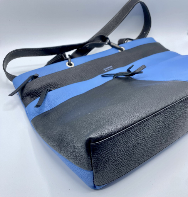 Le tote-bag en cuir grainé noir et bleu, pouvant contenir ordinateur et cahier de grands formats :